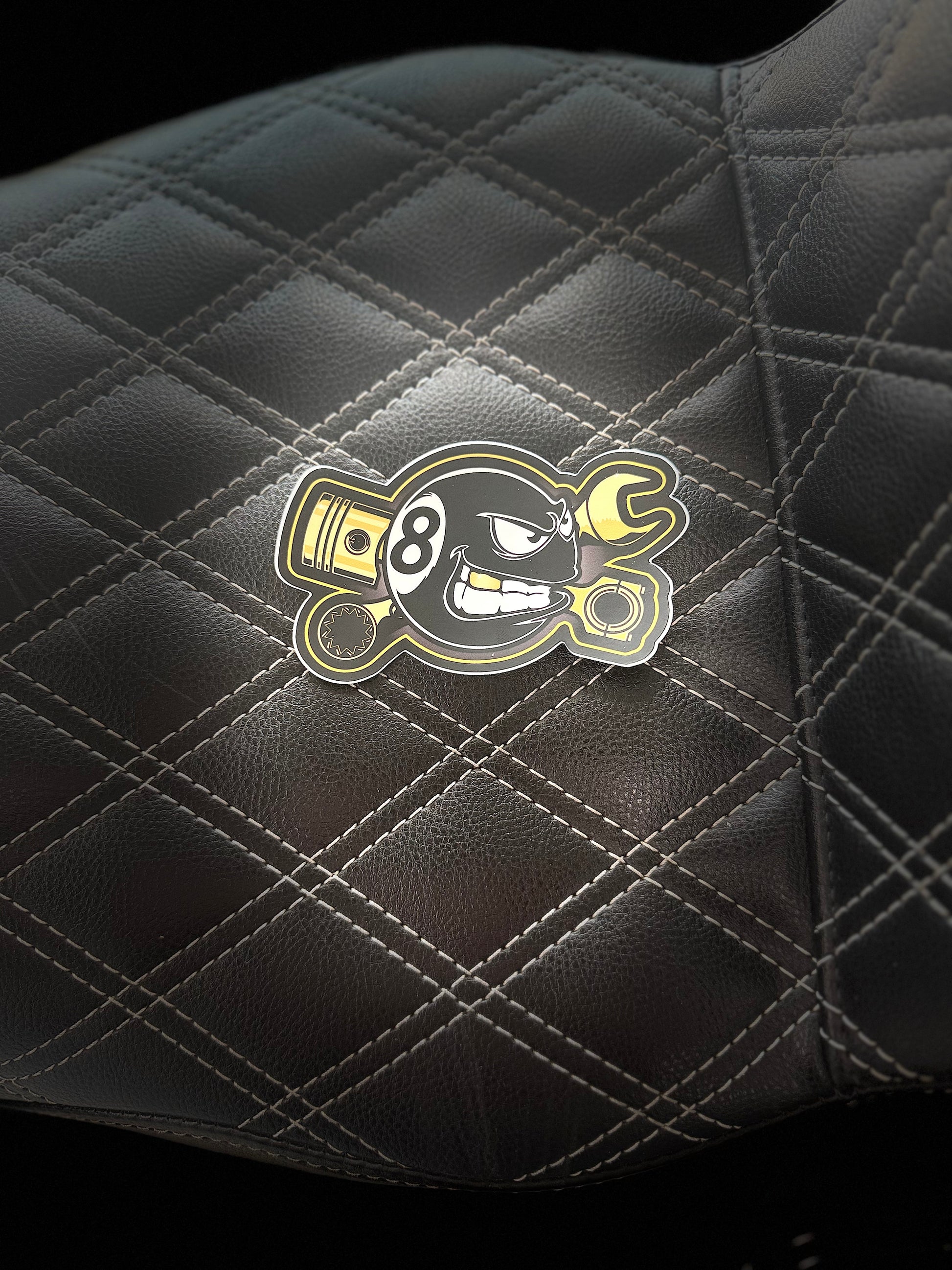 The crazy 8’s center logo sticker 2.5 in. Tall 4 in. Wide