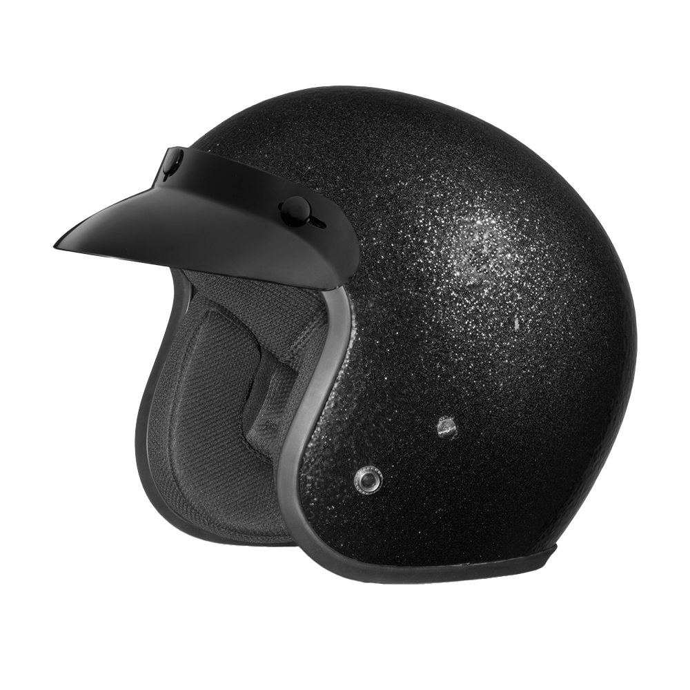 Our D.O.T. Daytona Cruiser 3/4 Shell Helmet In The Black Metal Flake, Meets And Exceeds D.O.T. FMVSS 218 Standards And Is The Smallest D.O.T. 3/4 Shell Helmet Ever Made!! With 3 Different Shell Sizes, You're Sure To Get That Proportionate Fit!! Available Only With Removable, Snap On Gloss Black Bubble Visor. Many More Colors And Designs Available Such As Soft Touch Dull Black, Hi-Gloss Black And Hi-Gloss White; Custom Colors: Gun Metal Grey Metallic; Specialty Items: Graphics. Head Wrap And Cloth Draw String Bag Included. Sizes Range From XS-2XL.