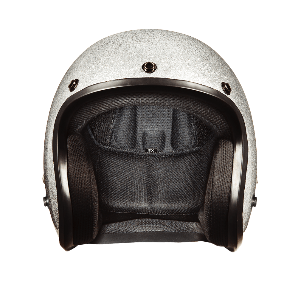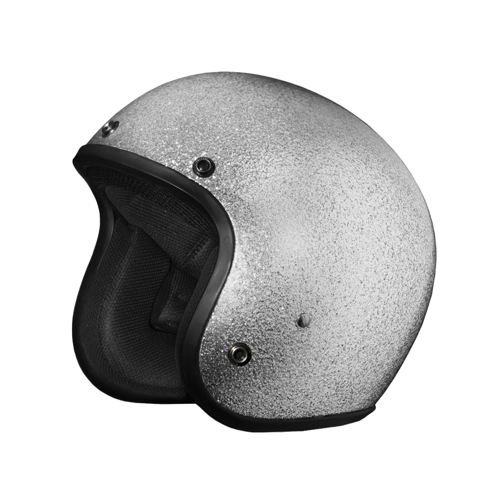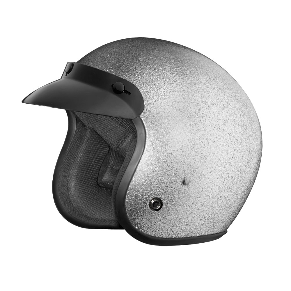 Our D.O.T. Daytona Cruiser 3/4 Shell Helmet In The Silver Metal Flake, Meets And Exceeds D.O.T. FMVSS 218 Standards And Is The Smallest D.O.T. 3/4 Shell Helmet Ever Made!! With 3 Different Shell Sizes, You're Sure To Get That Proportionate Fit!! Available Only With Removable, Snap On Gloss Black Bubble Visor. Many More Colors And Designs Available Such As Soft Touch Dull Black, Hi-Gloss Black And Hi-Gloss White; Custom Colors: Gun Metal Grey Metallic; Specialty Items: Graphics. Head Wrap And Cloth Draw String Bag Included. Sizes Range From XS-2XL.