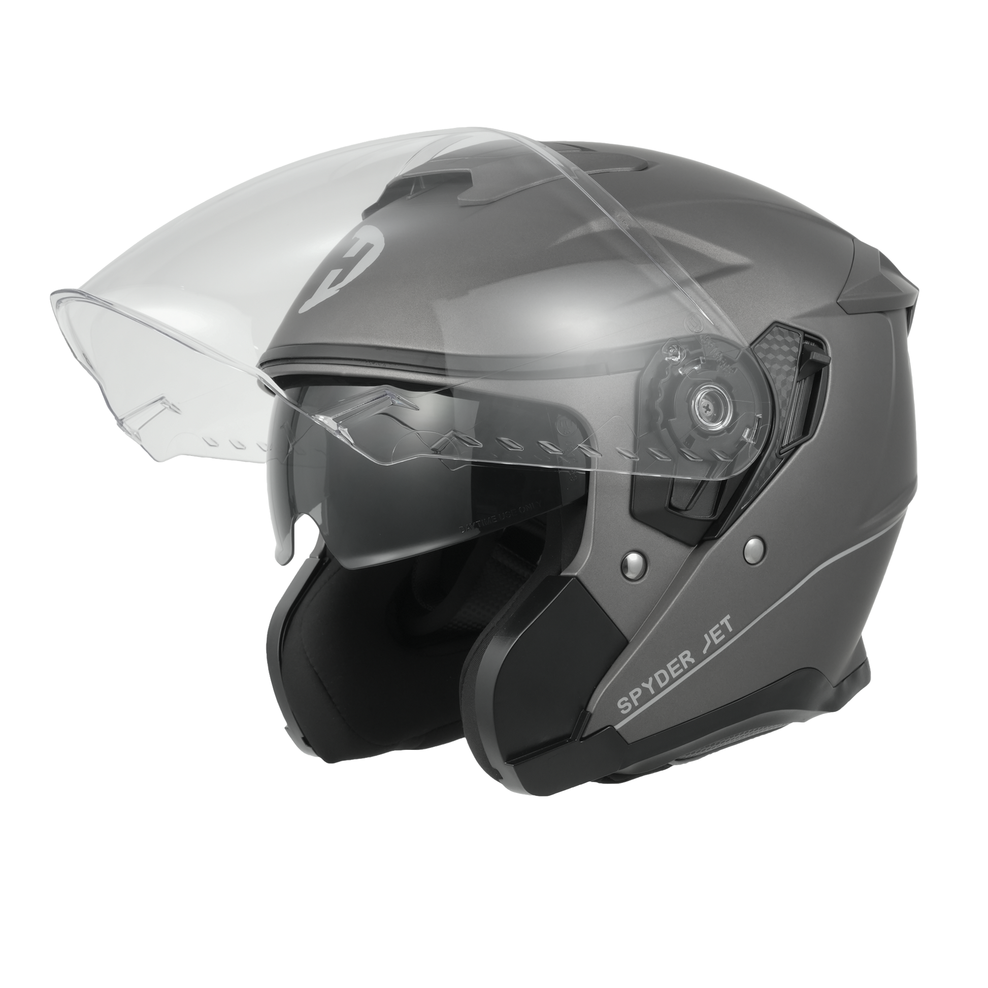 Our D.O.T. And ECE Daytona Spyder Jet Helmet In The Gun Metal Grey Dull Metallic Finish, Meets And Exceeds D.O.T. FMVSS 218 And ECE 22R06 Standards!! Features A Dual Shield System; Outer Anti-Scratch Clear Shield And Inner Anti-Scratch Retractable Smoke Shield. Also Has A Quick Release Lock Retention System; One Finger Release Lever For Easy Detachment And A Removable, Hand Washable Interior (Moisture Wicking Fabric). Bluetooth Compatible. Cloth Draw String Bag Included. Sizes Range From XS-2XL.